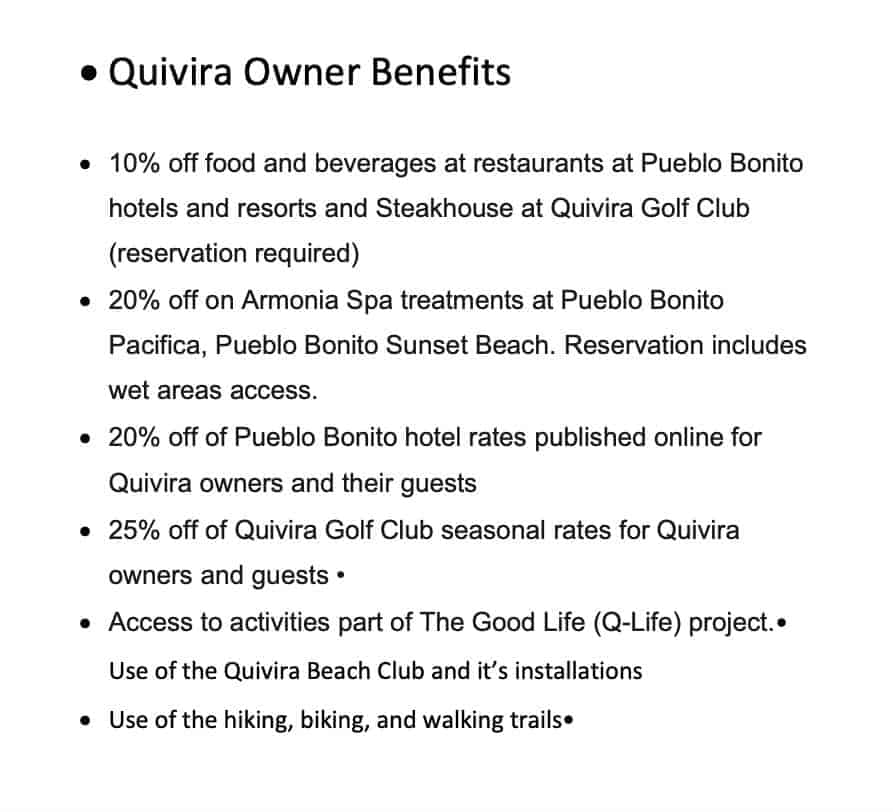Las viviendas tendrán un 25% de descuento en el acceso completo al campo de golf cuando se afilien al Beach Club. Hay 21 restaurantes y un spa donde los visitantes pueden concertar citas. La urbanización cuenta con una puerta de seguridad 24 horas. La planta desalinizadora de Quivira suministra el agua.